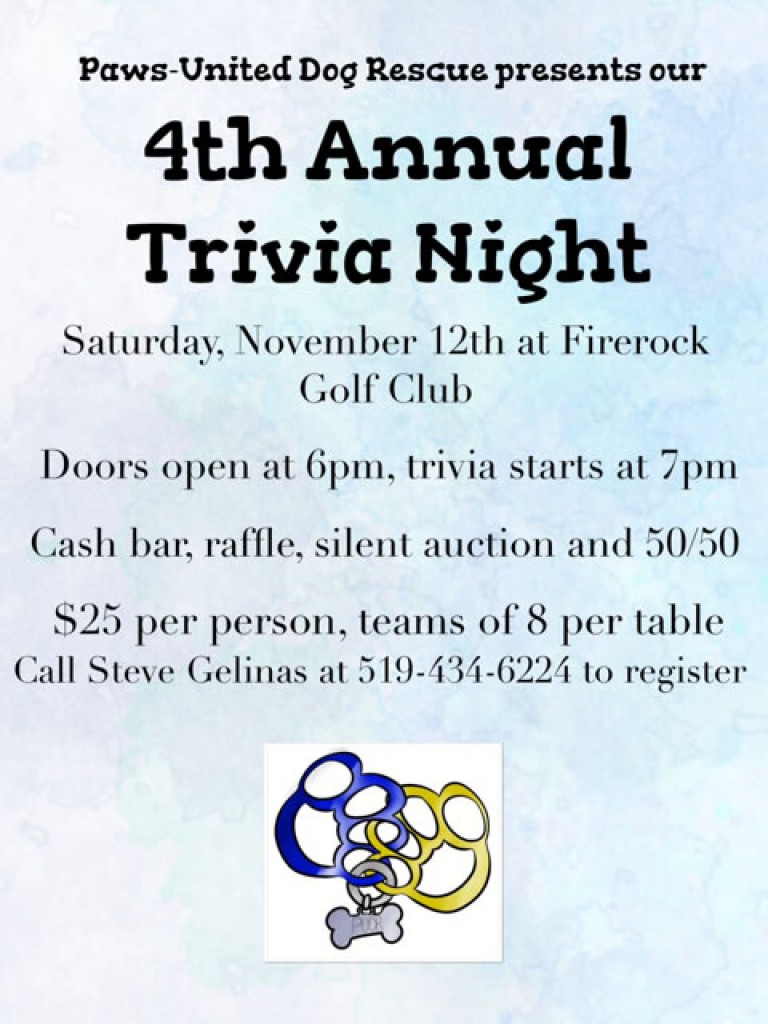 Get a team of 8 together and enjoy trivia, laughs, drinks, silent auction, raffle, food, door prizes and knowing you helped save a dogs life.